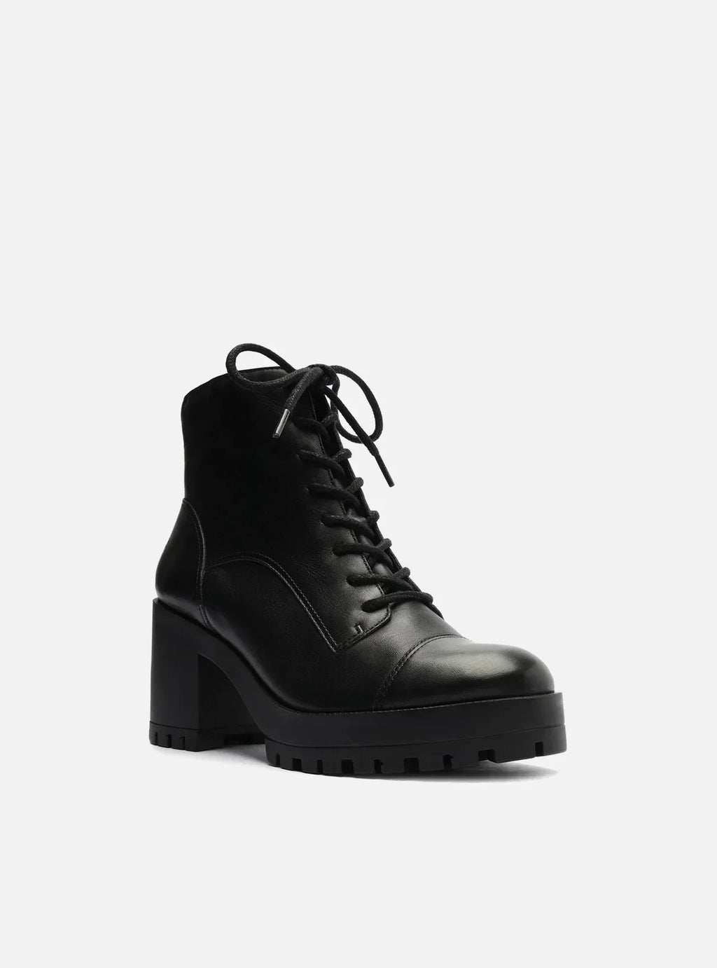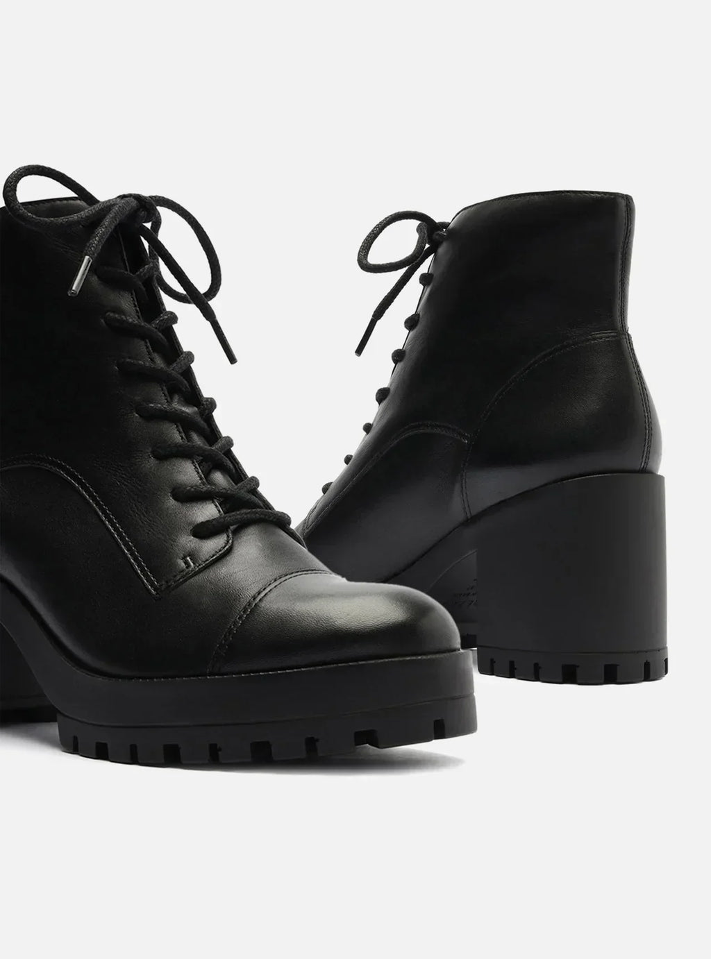 Descrição:Bota coturno preta de couro. O modelo tem cano curto, salto médio bloco e bico redondo. Possui base emborrachada tratorada preta. Traz costuras no cabedal e calcanhar e fecho em amarração por cadarços pretos cobrindo toda a parte frontal.