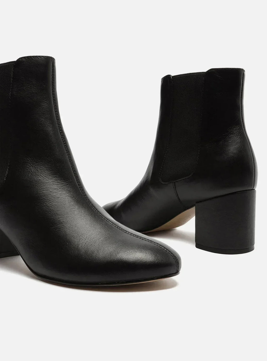 Descrição:Bota preta de couro. O modelo tem cano curto, salto médio bloco em fachete e bico redondo. Traz cabedal ajustado ao pé e elásticos nas laterais do cano, facilitando o calce.