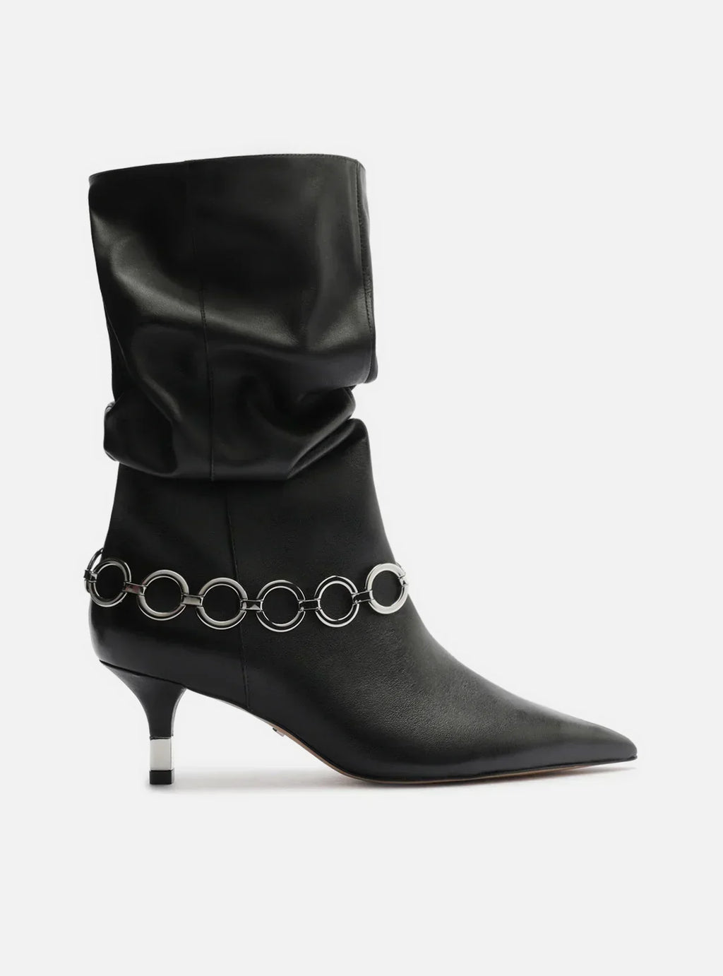Descrição:Bota preta de couro. O sapato tem cano médio com efeito amassado, salto médio fino com detalhe metálico e ponta fina. Traz cabedal ajustado ao pé e detalhe em enfeite de elos metálicos em torno do cano e removível. Não possui fechamento.