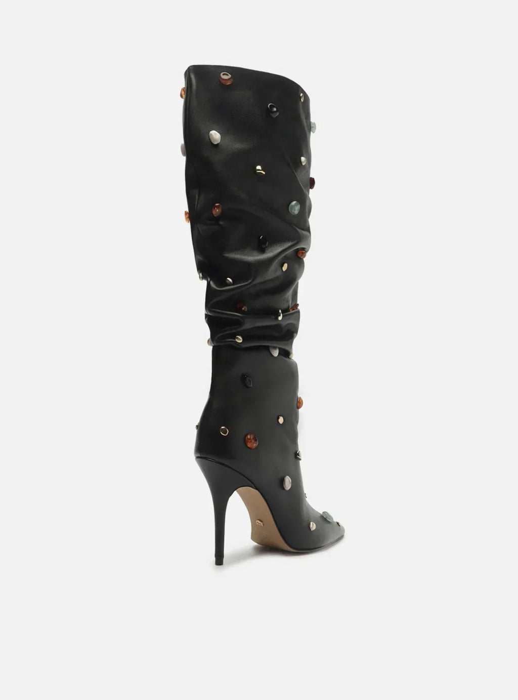Descrição: Bota preta de couro. O sapato tem cano longo com efeito amassado, salto alto fino e ponta fina. Traz cabedal ajustado ao pé e aplicação de pedras coloridas e metais por todo o cano. Não possui fechamento.